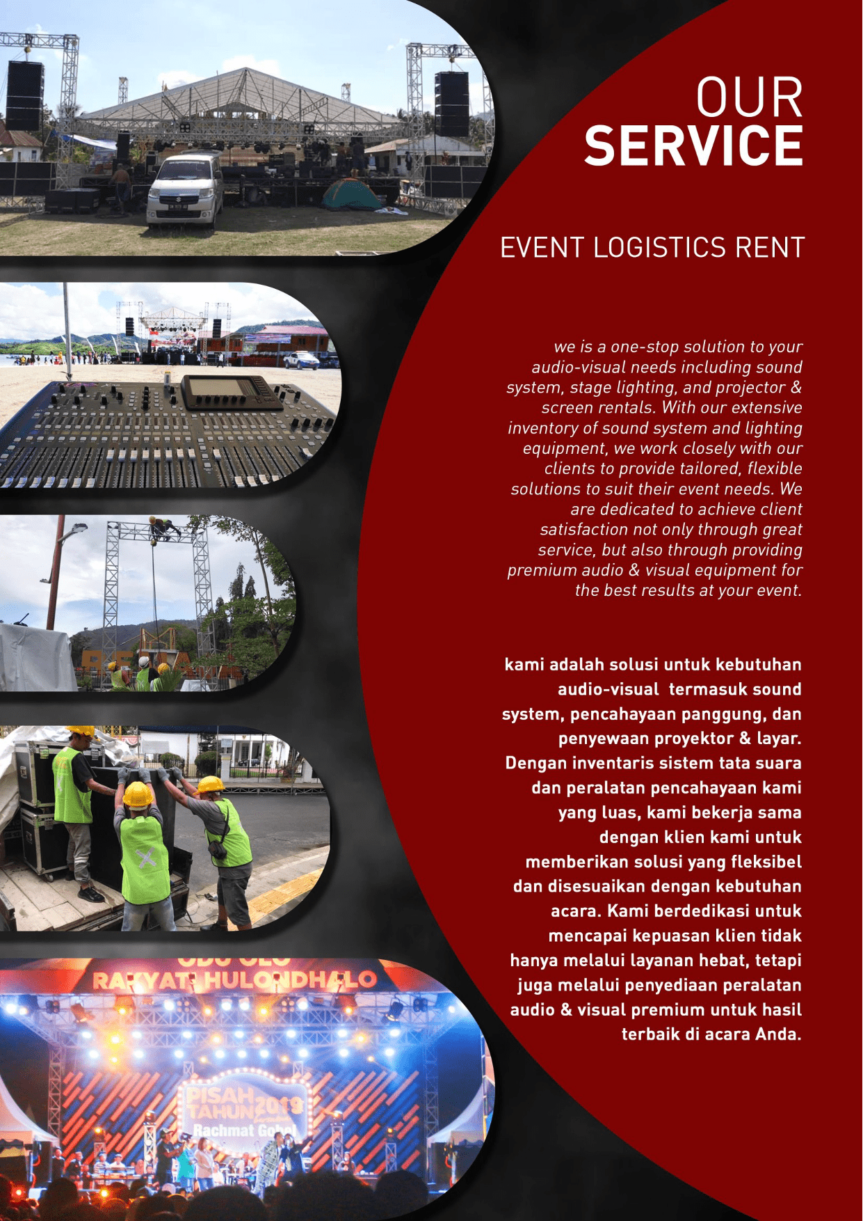 Menyediakan penyewaan Rigging Stage & Genset. Dengan dukungan spesifikasi alat terlengkap dan sumber daya manusia yang profesional